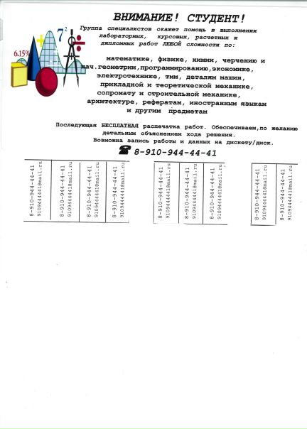 - Место работы: Группа специалистов окажет комплексную помощь по многим предметам: ЭЛЕКТРОТЕХНИКА, ФИЗИКА, МАТЕМАТИКА, ХИМИЯ, ЧЕРЧЕНИЕ, ТЕОРМЕХ, ПРОГРАММИРОВАНИЕ, ЭКОНОМИКА, РЕФЕРАТЫ, ИНОСТРАННЫЕ ЯЗЫКИ, ТММ, ДМ, СОПРОМАТ, АРХИТЕКТУРА и другие, ОНЛАЙН по многим предметам, , прибыль превыше всего, НО Честь превыше прибыли